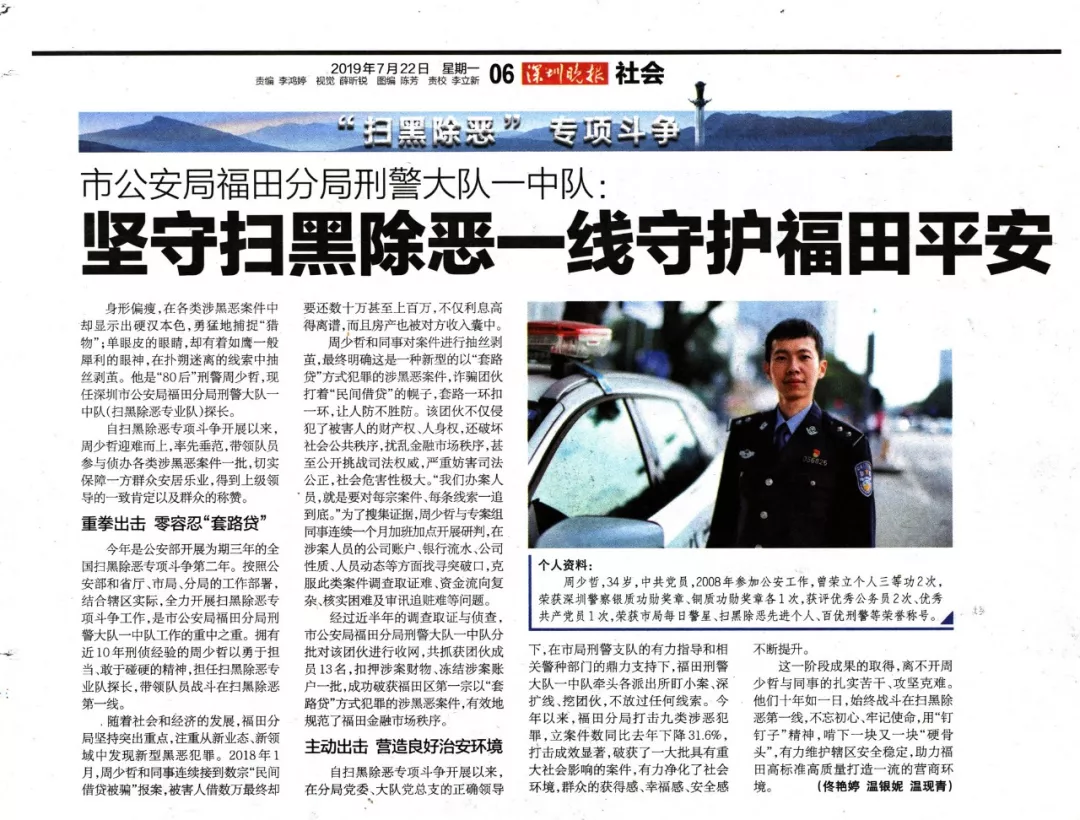 這一階段成果的取得,離不開周少哲與同事的扎實(shí)苦干、攻堅(jiān)克難。他們十年如一日,始終戰(zhàn)斗在掃黑除惡第一線,不忘初心、牢記使命,用“釘釘子”精神,啃下一塊又一塊“硬骨頭”,有力維護(hù)轄區(qū)安全穩(wěn)定,助力福田高標(biāo)準(zhǔn)高質(zhì)量打造一流的營(yíng)商環(huán)境。