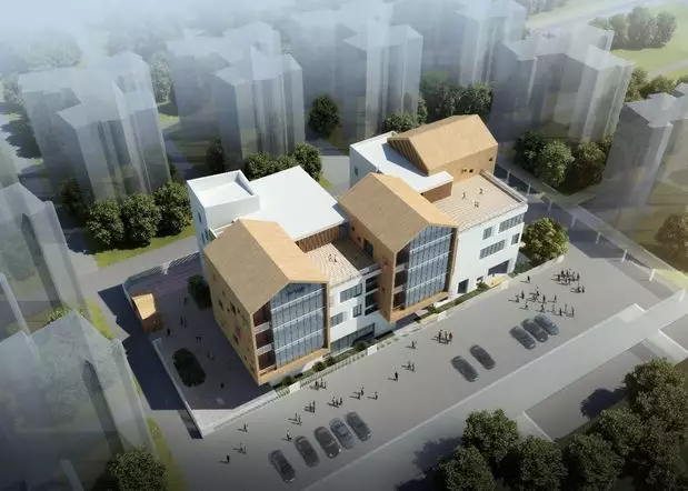 建筑造型簡潔現(xiàn)代,在白色體量上嵌入三個(gè)木色坡屋頂體塊,如積木城堡一般,富有童趣,建筑設(shè)有集中活動(dòng)平臺(tái)作為補(bǔ)充。