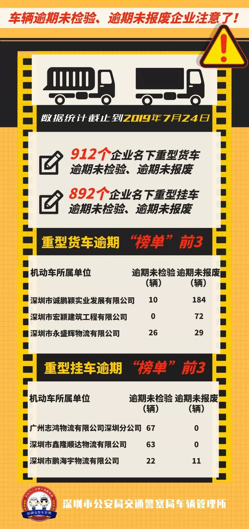 見(jiàn)圳客戶端·深圳新聞網(wǎng)2019年7月26日訊(見(jiàn)圳客戶端 深圳新聞網(wǎng)記者 何暢)車(chē)輛逾期未檢驗(yàn)、逾期未報(bào)廢,存在著重大交通安全隱患,深圳部分企業(yè)不重視安全管理、名下有大量“問(wèn)題車(chē)輛”未處理。7月26日“深圳交警權(quán)威發(fā)布”微信公眾號(hào)就對(duì)相關(guān)企業(yè)進(jìn)行了點(diǎn)名曝光。