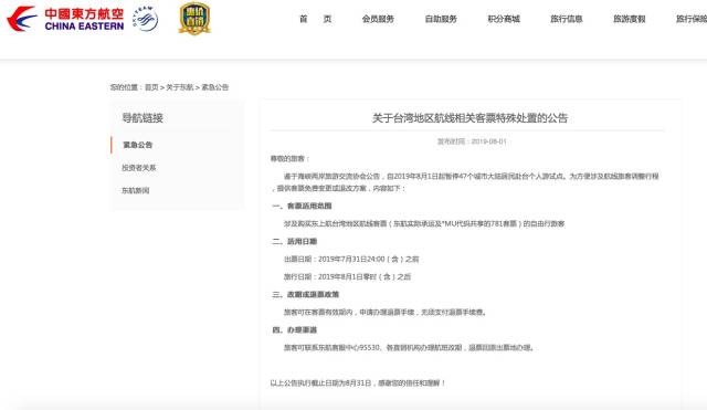 繼深航之后,東航也剛剛發(fā)布了關(guān)于臺灣地區(qū)航線相關(guān)客票特殊處置的公告:涉及購買東航臺灣地區(qū)航線客票(東航實際承運及*MU代碼共享的781客票)的自由行旅客,出票日期在2019年7月31日24:00(含)之前,旅行日期在2019年8月1日零時(含)之后的,旅客可在客票有效期內(nèi),申請辦理退票手續(xù),無須支付退票手續(xù)費。
