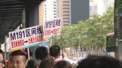 今天周六,準(zhǔn)備去往東部大小梅沙等景區(qū)的游客,擠滿了黃貝嶺公交站的站臺(tái),巴士集團(tuán)的工作人員,也是手舉線路標(biāo)識(shí)牌,在站臺(tái)維持秩序。