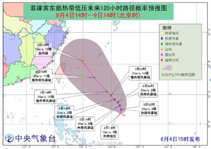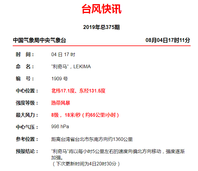 今年第9號臺風(fēng)"利奇馬"(熱帶風(fēng)暴級)(英文名稱:LEKIMA;名字來源:越南;名字意義:一種水果)已于4日下午在西北太平洋洋面生成,17時其中心位于我國臺灣省臺北市東南方約1360公里的西北太平洋洋面上,中心附近最大風(fēng)力8級(18米 /秒),中心最低氣壓998百帕,七級風(fēng)圈半徑250-420公里。