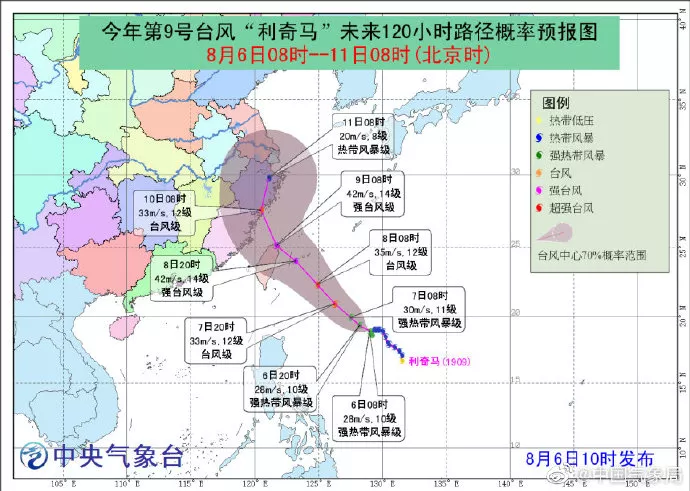 預計,“利奇馬”將以每小時5公里左右的速度緩慢向西北方向移動,強度逐漸增強,最強可達臺風級或強臺風級(12-14級,35-45米/秒),逐漸向我國東南沿??拷N磥韮商鞂ξ覈:S驘o影響。