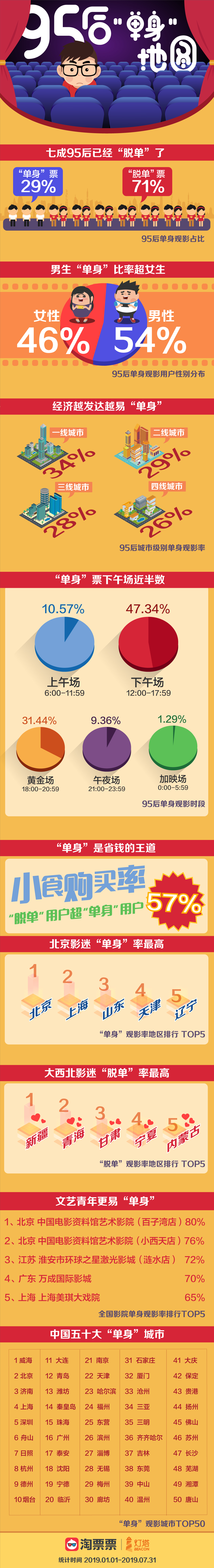 淘票票及燈塔專業(yè)版的數(shù)據(jù)顯示,在95后觀影人群中,有29%的用戶購買“單身票”(僅買一張票)觀影,而71%的95后均選擇購買兩張及以上電影票來觀影;在獨身觀影用戶中,男性以54%的占比超過女性8個百分點;情感狀態(tài)也在一定程度上決定了用戶的觀影習(xí)慣。報告數(shù)據(jù)顯示,95后“單身”用戶集中在白天觀影,僅下午場(12:00-17:59)占比就達(dá)到47.34%,而晚9點后的夜場份額占比僅1成左右。