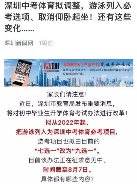 調整后,深圳體育中考分數(shù)由統(tǒng)一現(xiàn)場考試成績分值32分、過程性考核(平時成績)分值12分和《國家學生體質健康標準》測試分值6分組成,滿分為50分。其中,體育考試考試項目仍為“1+1”,即考生參加1項必考科目和1項選考項目。必考科目由現(xiàn)在的200米跑和中長跑(800米[女]和1000米[男])任選其一調整為中長跑(800米[女]和1000米[男])或100米游泳任選其一。