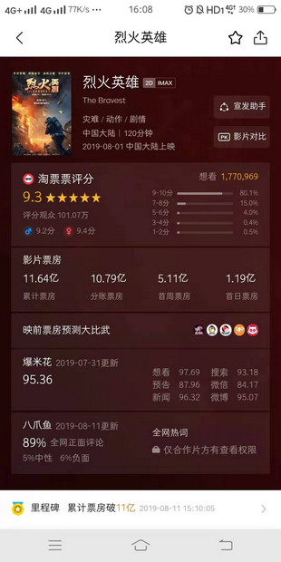 見圳客戶端·深圳新聞網(wǎng)2019年8月12日訊(見圳客戶端、深圳新聞網(wǎng)記者 陳婕)截止至8月12日下午4時(shí),記者從燈塔專業(yè)版app看到,由博納影業(yè)、阿里影業(yè)出品的電影《烈火英雄》票房達(dá)到11.64億元!這部改編自真實(shí)事件、致敬消防戰(zhàn)士的影片,展現(xiàn)出了時(shí)代精神和當(dāng)代中國英雄形象,收獲了口碑和票房的雙豐收。影片不僅獲得了高達(dá)9.3的淘票票評分,還成為了暑期檔第三部票房破10億的國產(chǎn)電影。業(yè)內(nèi)人士分析,《烈火英雄》有可能超過《掃毒2》,成為暑期檔國產(chǎn)真人電影的票房冠軍。