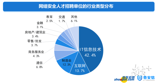 從用人單位的所屬行業(yè)來(lái)看,IT信息技術(shù)和互聯(lián)網(wǎng)行業(yè)對(duì)網(wǎng)絡(luò)安全人才需求量明顯高于其他行業(yè),分別占到了總量的42.4%和13.7%。需求排名第三的是制造業(yè),招聘數(shù)量占比12.3%。通信行業(yè)(6.8%)、商務(wù)服務(wù)業(yè)(4.3%)等排在其后。