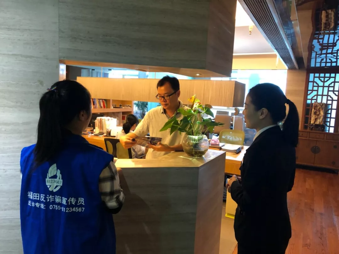 上午10時,深圳市公安局福田分局派出“藍馬甲”宣傳隊走入大中華國際交易廣場,逐層逐戶向企業(yè)員工們派發(fā)反詐騙宣傳單及《福田反詐騙教育??贰!八{馬甲”宣傳隊員走進各企業(yè)辦公室,向企業(yè)員工派發(fā)相關(guān)資料,講解反詐騙知識。各企業(yè)員工積極參與,與“藍馬甲”講師頻頻互動,并認真學習反詐騙技巧,努力提升自身反詐騙能力。