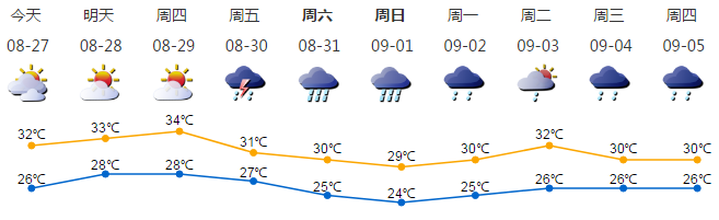 我市多云,局地有短時陣雨;氣溫26-32℃;偏南風2-3級;相對濕度65%-95%。