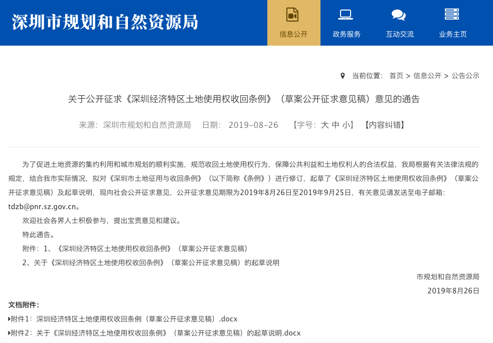 據(jù)了解,目前該《條例》(草案公開(kāi)征求意見(jiàn)稿)正向社會(huì)公開(kāi)征求意見(jiàn),公開(kāi)征求意見(jiàn)期限為2019年8月26日至2019年9月25日,有關(guān)意見(jiàn)請(qǐng)發(fā)送至電子郵箱:tdzb@pnr.sz.gov.cn。