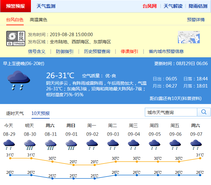 見(jiàn)圳客戶端·深圳新聞網(wǎng)2019年8月29日訊 記者從深圳市氣象臺(tái)獲悉,第12號(hào)臺(tái)風(fēng)“楊柳”(熱帶風(fēng)暴級(jí))預(yù)計(jì)將向偏西方向移動(dòng),趨向海南南部沿海,29日距離我市最近,約500-600公里。市氣象臺(tái)已于28日15時(shí)發(fā)布臺(tái)風(fēng)白色預(yù)警信號(hào)。受“楊柳”外圍環(huán)流影響,預(yù)計(jì)29-30日有間歇性降雨,雨量達(dá)大雨,局部暴雨;本周末至下周中期,天氣不穩(wěn)定,降雨持續(xù)。