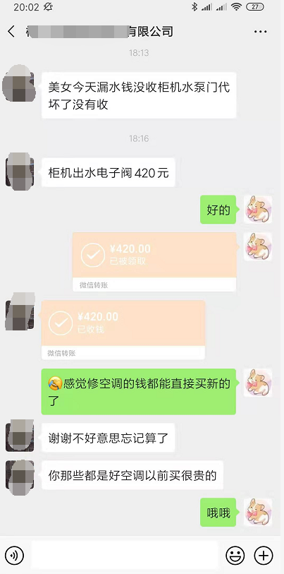 藍(lán)先生的妹妹在58同城小助手,找到了深圳市易臣國際貨運(yùn)代理有限公司,并預(yù)約了上門清洗空調(diào)的服務(wù)。當(dāng)師傅上門以后,除了清洗外,還說空調(diào)存在多個(gè)問題,如需要加雪種(學(xué)名“氟利昂”)、線路老化、空調(diào)漏水等,6臺(tái)空調(diào)整體清洗加修理下來,藍(lán)小姐當(dāng)天共花費(fèi)6618元。