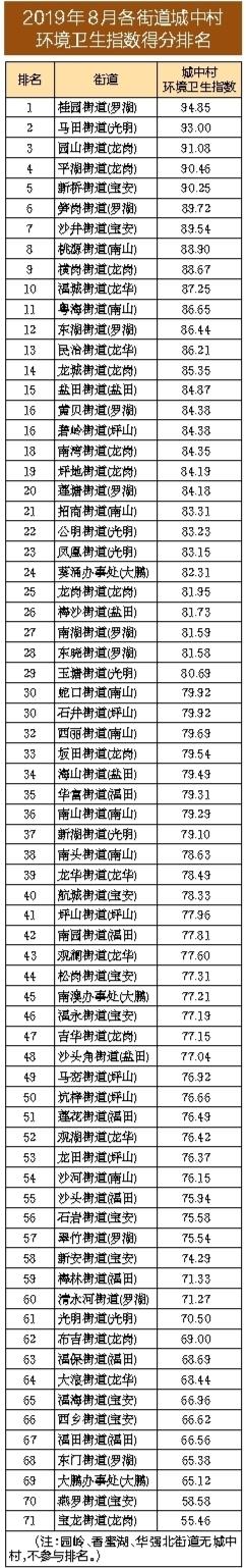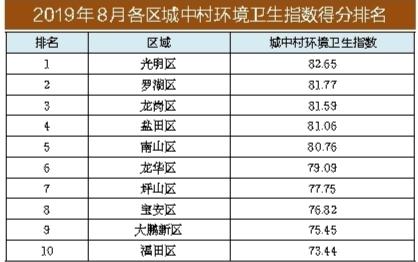 全市城中村首次單獨“應(yīng)考”,成績?nèi)绾??根?jù)公布的測評結(jié)果,深圳市城中村環(huán)境衛(wèi)生指數(shù)為79.05分,光明區(qū)、羅湖區(qū)、龍崗區(qū)城中村環(huán)境衛(wèi)生指數(shù)位列三甲,城中村人口密度較大的福田區(qū)則在首次公布的城中村環(huán)境衛(wèi)生指數(shù)排名中墊底。排名前3的街道分別是桂園街道(羅湖)、馬田街道(光明)和園山街道(龍崗),而排名后3的街道分別是寶龍街道(龍崗)、燕羅街道(寶安)和大鵬辦事處(大鵬)。