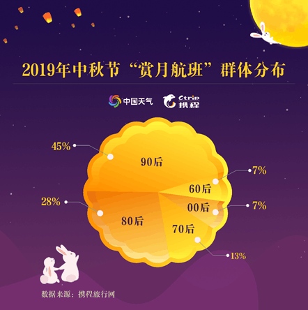 不僅如此,年齡結構上,90后是空中追月人數最多的群體,占比為45%;其次是80后,占比達28%;70后和00后分列第三、第四位,占比分別為13%、7%。中秋當晚(9月13日)、出發(fā)時間在18時至24時之間的航班通常被稱作“賞月航班”,機上乘客在飛行途中能近距離“接觸月亮”,感受“彩云追月”的新奇體驗。