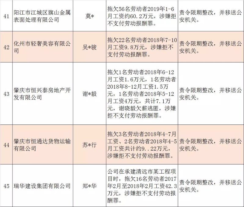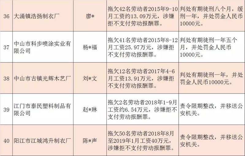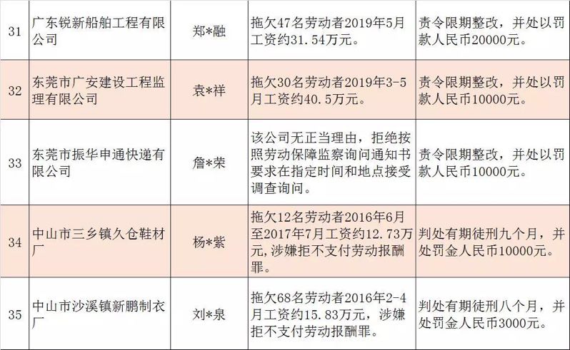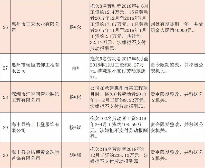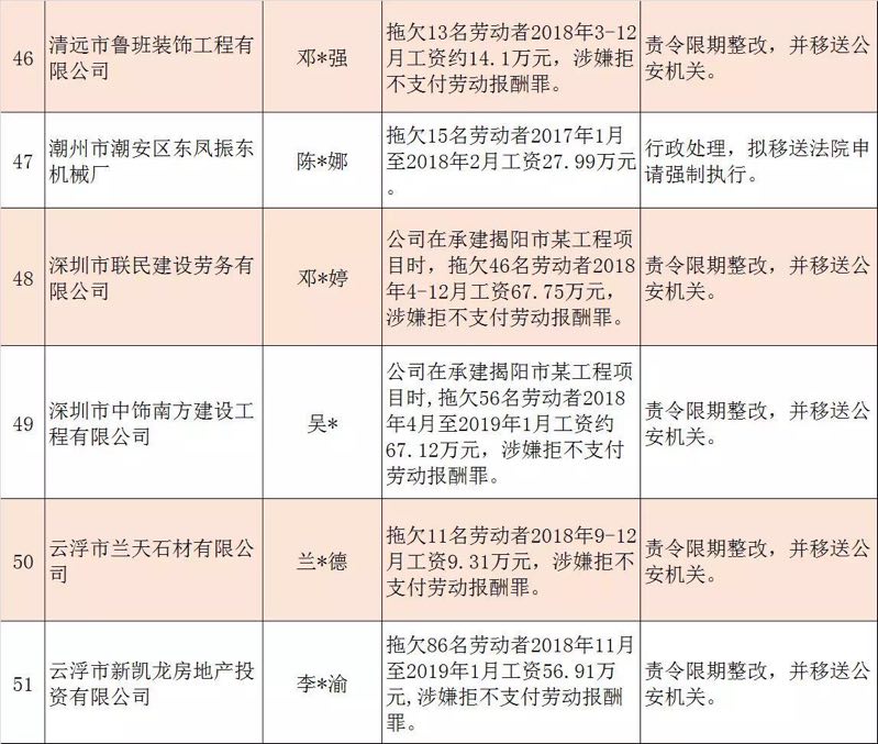 今年第二季度以來,廣東省人力資源社會(huì)保障行政部門繼續(xù)加大對(duì)欠薪等重大違法行為的打擊力度,各地特別是廣州、深圳、珠海、惠州、中山等地對(duì)欠薪逃匿、欠薪屢教不改、欠薪涉及人數(shù)和金額巨大等違法行為重拳出擊,依法處罰處理,對(duì)涉嫌犯罪的堅(jiān)決移送司法機(jī)關(guān)繩之以法,切實(shí)維護(hù)勞動(dòng)者的勞動(dòng)報(bào)酬等權(quán)益。為加強(qiáng)對(duì)違法用人單位的社會(huì)監(jiān)督,強(qiáng)化誠(chéng)信體系建設(shè),加大威懾力,日前省人社廳披露了2019年第三批重大違法案件,這51家黑心企業(yè)中就有10家是深圳“揪”出來的(如圖)。