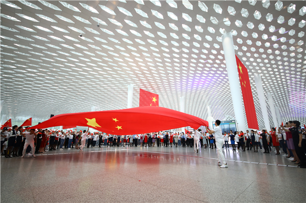 見圳客戶端·深圳新聞網(wǎng)2019年9月17日訊(見圳客戶端、深圳新聞網(wǎng) 記者 涂勝 通訊員 葉丹)為慶祝中華人民共和國成立70周年,9月17日,深圳機(jī)場聯(lián)合深圳空管站、機(jī)場海關(guān)、邊檢、公安及各航空公司,在深圳機(jī)場航站樓出發(fā)大廳、地面交通中心、國內(nèi)候機(jī)區(qū)等區(qū)域舉辦“樂動(dòng)空港歌唱祖國”演出活動(dòng)。當(dāng)天,共有200余人次參加現(xiàn)場演出?;顒?dòng)現(xiàn)場,五星紅旗飄揚(yáng),航站樓內(nèi)匯成一片紅色的海洋。