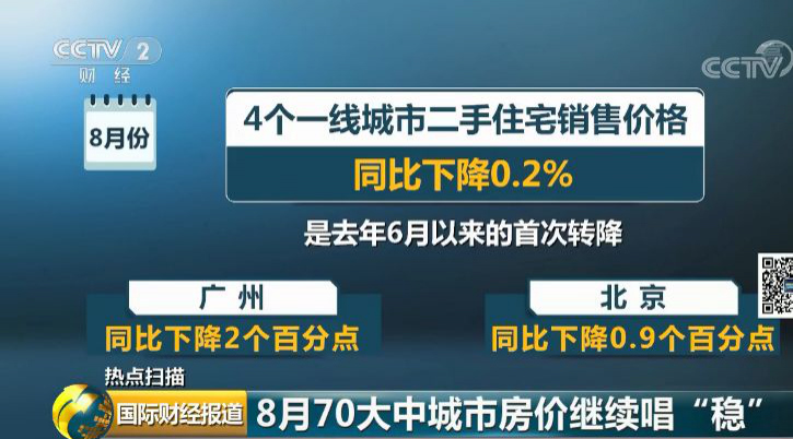 央視財(cái)經(jīng)2019年9月18日訊 近日,國(guó)家統(tǒng)計(jì)局發(fā)布了8月份70個(gè)大中城市商品住宅銷售價(jià)格變動(dòng)情況:一二線城市新建商品住宅和二手住宅銷售價(jià)格環(huán)比、同比漲幅均與上月相同或回落;三線城市新建商品住宅銷售價(jià)格環(huán)比漲幅與上月相同,二手住宅漲幅微升。