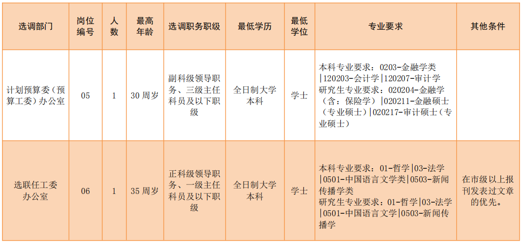 選調(diào)條件要求具有3年以上公務員工作經(jīng)歷(含試用期),已進行公務員登記,且歷年公務員年度考核為稱職及以上等次。全日制普通高校大學本科以上學歷,學士以上學位。副科級領導職務、三級和四級主任科員、一級科員年齡在30周歲以下(1988年9月30日以后出生),正科級領導職務、一級和二級主任科員年齡在35周歲以下(1983年9月30日以后出生)等。