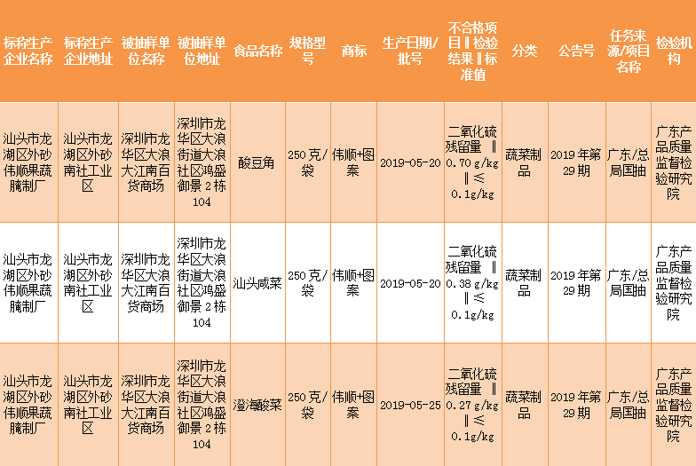龍華大浪大江南百貨商場賣的酸豆角、汕頭咸菜和澄海酸菜因二氧化硫殘留量超標上黑榜了
