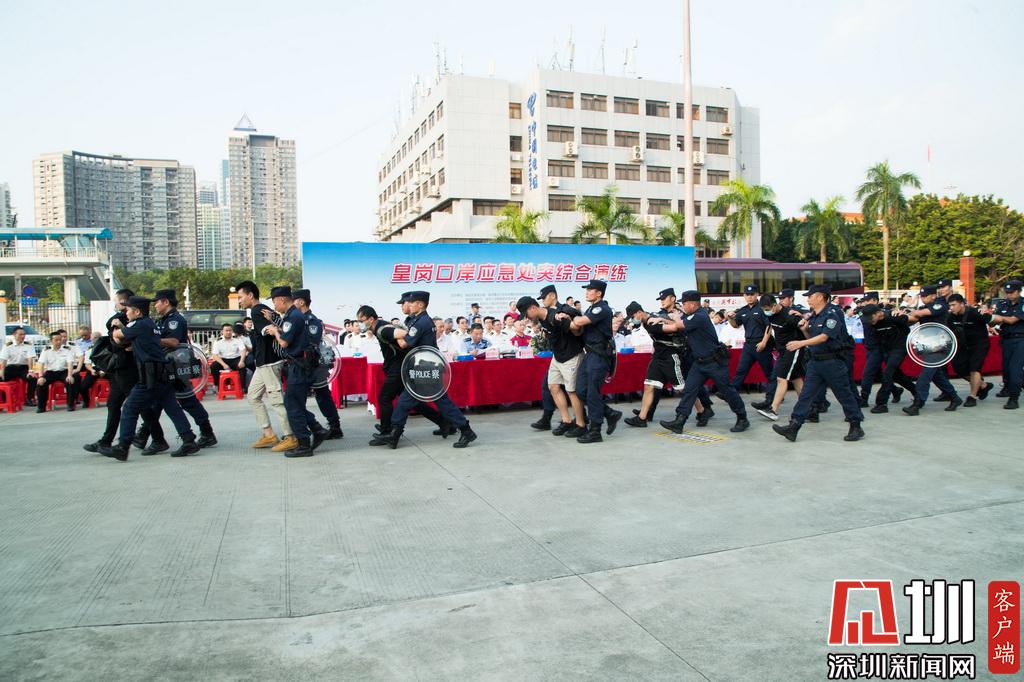 下午5時(shí),隨著演練總指揮福田區(qū)委副書記黃曉鵬一聲令下,演練正式開始?;蕧徣刖硰d,黑衣“不法分子”拒檢、傷人、拉橫幅鬧事,海關(guān)、邊檢呼叫增援……事態(tài)步步升級(jí),觸發(fā)皇崗口岸聯(lián)勤聯(lián)動(dòng)機(jī)制,根據(jù)應(yīng)急預(yù)案,隨著各項(xiàng)指令有條不紊地下達(dá),皇崗口岸派出所、福田反恐大隊(duì)、武警深圳支隊(duì)、福田交警大隊(duì)、福田急救中心、福田街道武裝部民兵應(yīng)急分隊(duì)、皇崗口岸管理處等聯(lián)勤聯(lián)動(dòng)力量,迅速趕到現(xiàn)場進(jìn)行處置。在“法律告知”無效、危險(xiǎn)行為繼續(xù)的情況下,警方果斷實(shí)施抓捕,將黑衣“不法分子”一網(wǎng)打盡,在最短時(shí)間內(nèi)恢復(fù)了皇崗口岸的正常秩序。