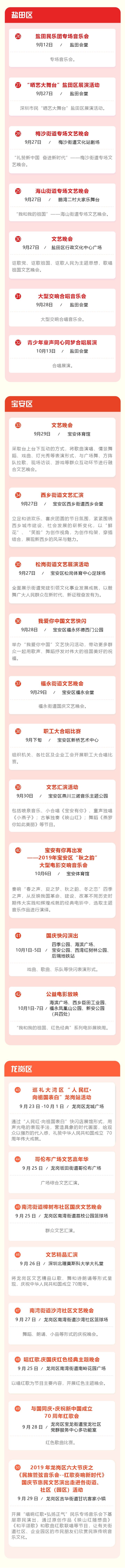 深圳特區(qū)報(bào)2019年9月26日訊 為熱烈慶祝中華人民共和國(guó)成立70周年,深圳市將舉辦規(guī)模盛大的全市性專場(chǎng)音樂會(huì)、群眾文藝晚會(huì)、焰火晚會(huì)等活動(dòng),同時(shí)將在各區(qū)舉辦80場(chǎng)“我和我的祖國(guó)”國(guó)慶群眾文藝嘉年華活動(dòng),并在全市各區(qū)舉行“愛我中華——南粵百園慶國(guó)慶”主題游園。各有關(guān)活動(dòng)安排如下: