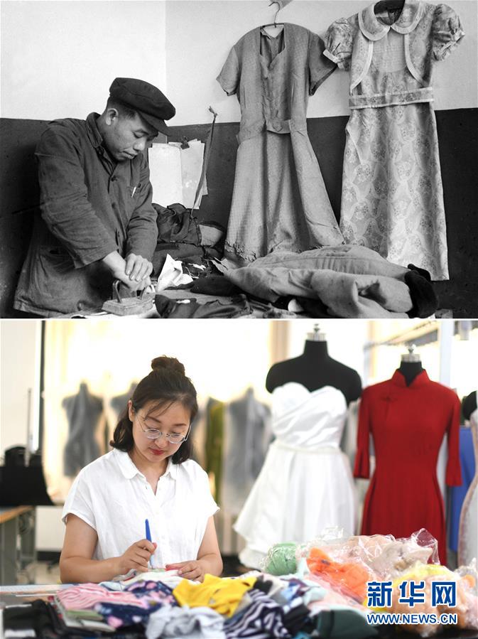 拼版照片:上圖為1957年,天津市縫紉供銷社職工在用舊大褂改制當(dāng)時(shí)女性流行的服裝——“布拉吉”(俄語(yǔ)“連衣裙”的音譯)(新華社記者梁一丁攝);下圖為2019年6月20日,天津工業(yè)大學(xué)針織與針織服裝系教師匡麗赟在學(xué)校教室使用服裝企業(yè)廢棄的舊面料進(jìn)行創(chuàng)作(新華社記者岳月偉攝)。
