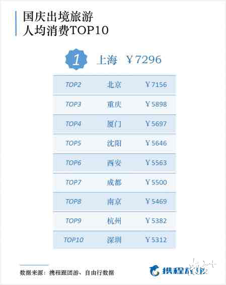 而國慶假期國人出境游花費多少錢?據攜程出境游數據顯示,國慶通過攜程旅游平臺報名跟團游、自由行、定制游等度假產品的人均花費是國內游價格的近2倍。出境游消費力前十名出發(fā)城市為上海、北京、重慶、廈門、沈陽、西安、成都、南京、杭州和深圳。上海和北京出境游人均花費超過了7000元,遠遠超過了其他城市。