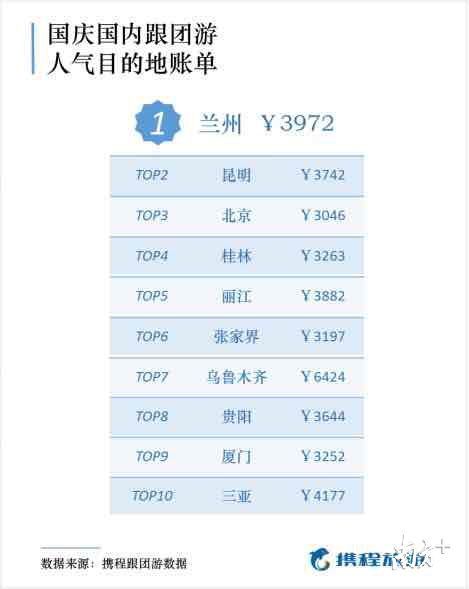 哪些國內旅游城市是今年國慶的贏家?根據攜程跟團游,最受游客歡迎的國內旅游城市前十分別是蘭州、昆明、北京、桂林、麗江、張家界、烏魯木齊、貴陽、廈門和三亞。其中前往蘭州人均花費近4000元。