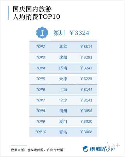 哪些城市居民的平均消費最高?根據攜程跟團游和自由行數據,“國內游消費力前十強城市”依次為深圳、北京、沈陽、濟南、天津、上海、寧波、福州、廈門和青島。這些城市國慶旅游單次國內游人均花費超過3000元,其中深圳人最舍得花錢,單次國內旅游人均花費達到了3324元。