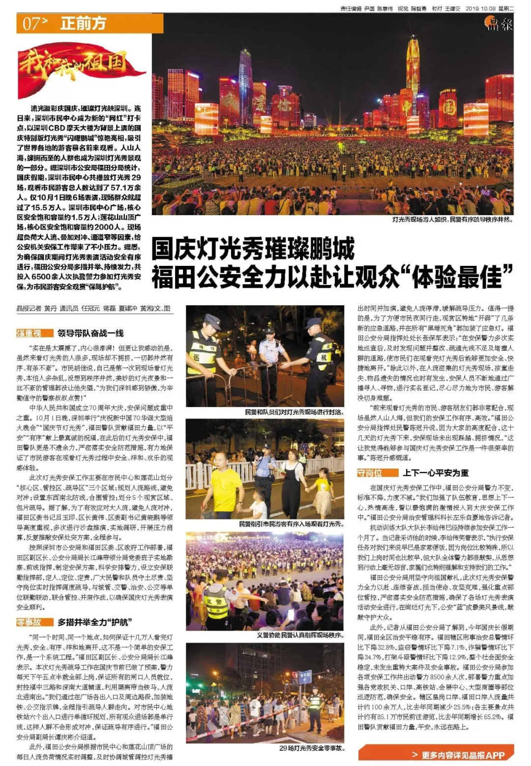 中華人民共和國(guó)成立70周年大慶,安保問題成重中之重。10月1日晚,深圳舉行“慶祝新中國(guó)70華誕大型焰火晚會(huì)”、“國(guó)慶節(jié)燈光秀”,福田警隊(duì)貢獻(xiàn)福田力量,以“平安”、“有序”獻(xiàn)上最真誠(chéng)的祝福,在此后的燈光秀安保中,福田警隊(duì)更是不遺余力,嚴(yán)密落實(shí)安全防范措施,有力地確保了市民游客在觀看燈光秀過程中安全、祥和、歡樂的觀感體驗(yàn)。