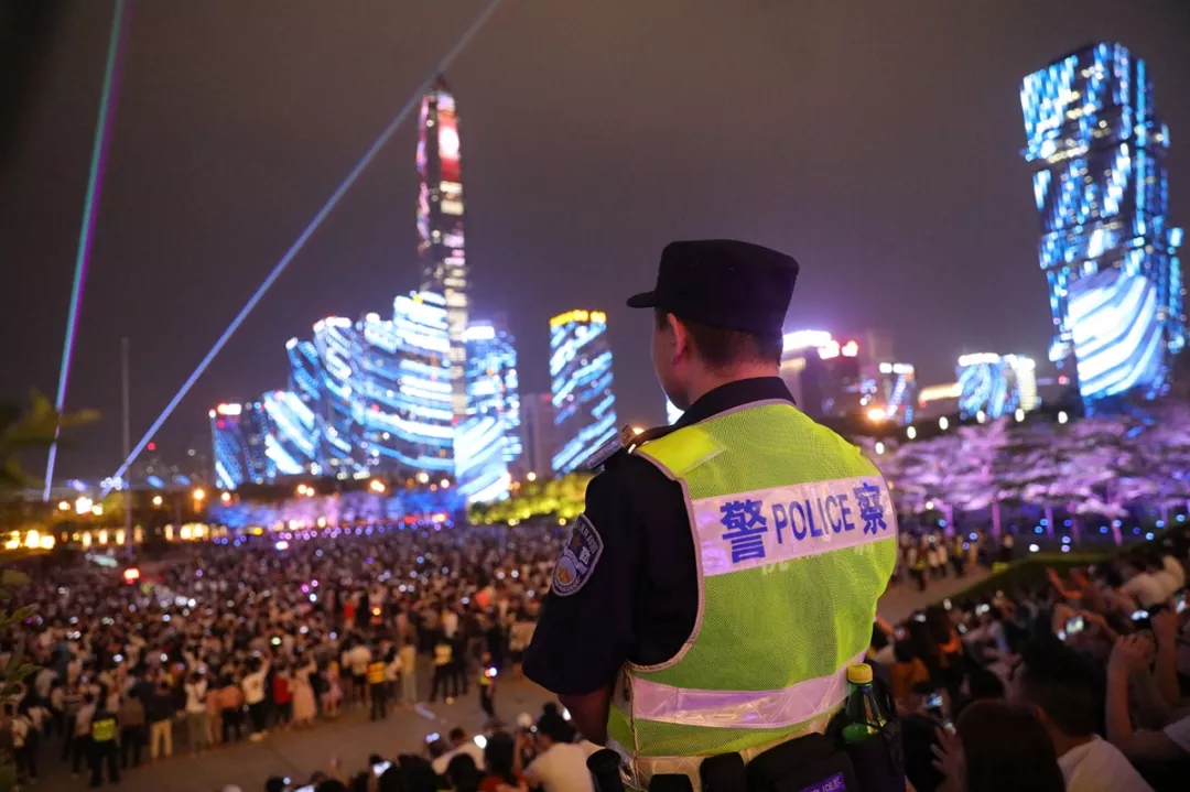 此外,福田公安分局根據(jù)市民中心和蓮花山頂廣場(chǎng)的每日人流負(fù)荷情況實(shí)時(shí)調(diào)整,及時(shí)協(xié)調(diào)城管調(diào)控?zé)艄庑悴コ鰰r(shí)間并加演,避免人流停滯,緩解疏導(dǎo)壓力。值得一提的是,為了方便市民夜間行走,觀賞區(qū)特地“開辟”了幾條新的應(yīng)急道路,并在所有“黑暗死角”都加裝了應(yīng)急燈。福田公安分局指揮處處長(zhǎng)張保軍表示:“在安保警力多次實(shí)地巡查后,及時(shí)發(fā)現(xiàn)問題并整改、疏通光線不足及堵塞人群的道路,使市民們?cè)谟^看完燈光秀后能夠更加安全、快捷地離開?!背艘酝?,在人流密集的燈光秀現(xiàn)場(chǎng),孩童走失、物品遺失的情況也有發(fā)生,安保人員不斷地通過廣播尋人、尋物,進(jìn)行實(shí)名登記,盡心盡力地為市民、游客解決切身難題。