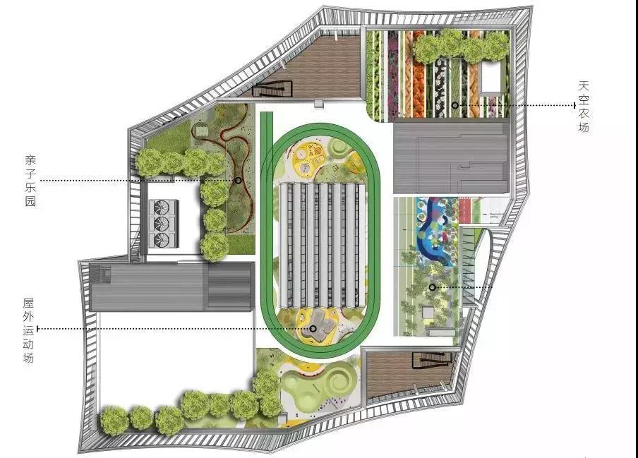 屋頂農場充分利用空間,打造天空農場、親子樂園、屋外運動場??罩械呐艿?,肥沃的土壤,瓜果蔬菜的金色豐收,讓自然在城市落地生根。小朋友們可以在其中,種植汗水,開花結果,收獲自然的饋贈。