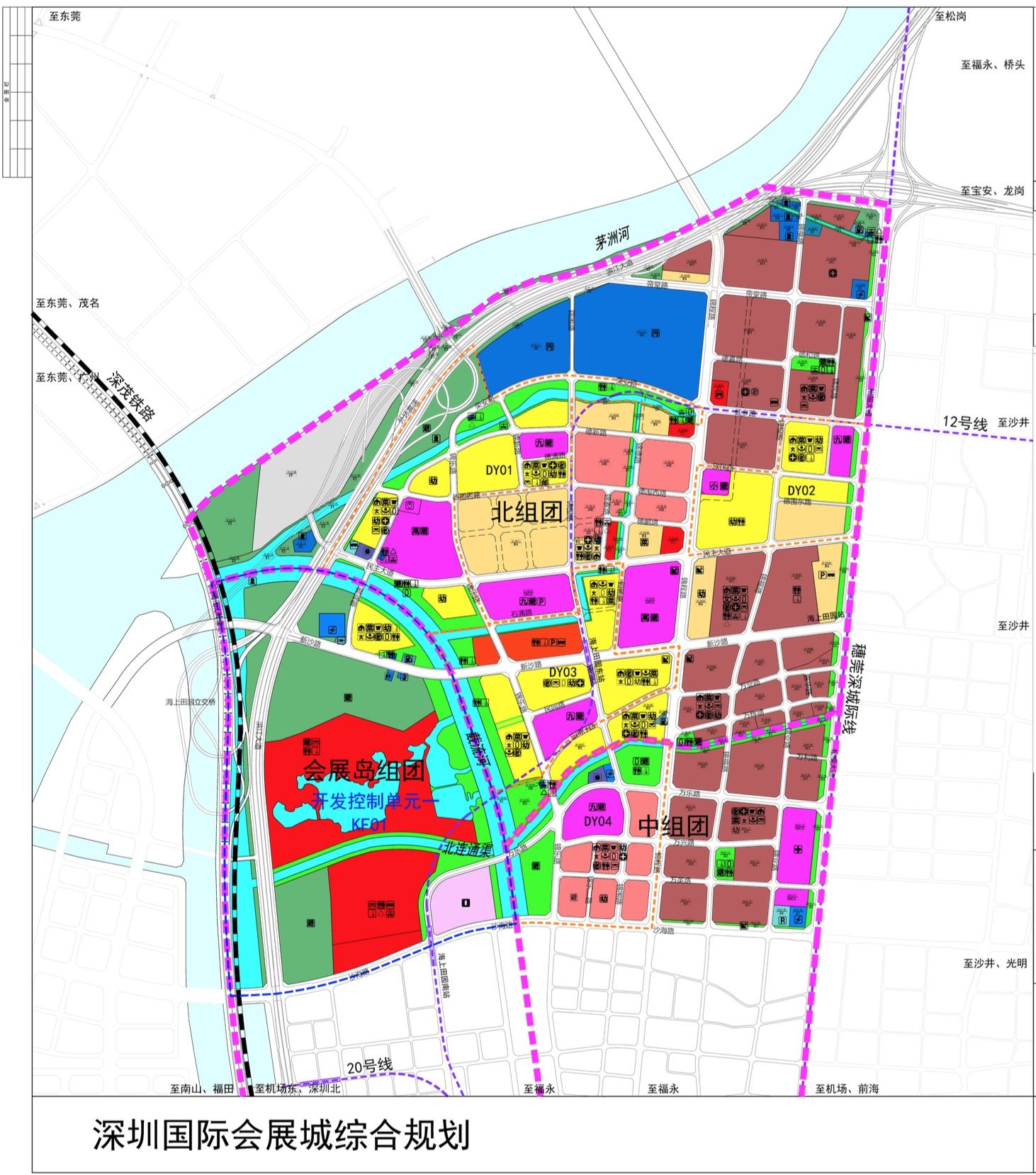 “深圳國際會展城”范圍北抵茅洲河、東至松福大道、南臨福永河、西側主要以廣深沿江高速公路為界,并包括規(guī)劃寶安綜合港區(qū),范圍共計22.57平方公里,規(guī)劃區(qū)劃分為三個片區(qū):國際會展中心片區(qū)、海上田園片區(qū)和寶安綜合港區(qū)。