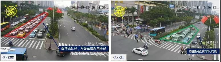 10月2日,針對(duì)車(chē)道劃分與交通需求不匹配的問(wèn)題,調(diào)整北進(jìn)口車(chē)道劃分,由2左轉(zhuǎn)2直行調(diào)整為1左轉(zhuǎn)3直行,并調(diào)整路口紅綠燈方案,適當(dāng)增加北方向單放綠燈時(shí)間,降低南、北對(duì)直綠燈時(shí)間。優(yōu)化后,北方向通行效率提升明顯,晚高峰期間小時(shí)通過(guò)量由820pcu/h提高至980pcu/h,提升19.5%。