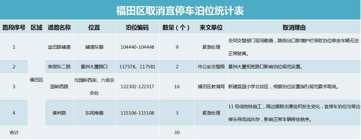 見圳客戶端?深圳新聞網(wǎng)2019年10月28日訊訊 10月28日,深圳市交通運輸局、深圳市公安局交通警察局發(fā)布通告稱,將取消福田區(qū)等6區(qū)20條道路共計338個宜停車泊位。現(xiàn)將取消6個區(qū)部分宜停車泊位情況進行公示,市民有意見可于2019年11月26日前反饋。