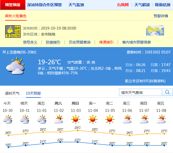 見圳客戶端·深圳新聞網(wǎng)2019年10月30日訊 深圳市氣象局預(yù)計(jì)30-31日多云間晴天,空氣干燥,氣溫19-26℃,早晚較涼;受冷空氣和熱帶低壓共同影響,30-31日沿海、高地和海區(qū)陣風(fēng)6-7級(jí)。11月1-5日晴天間多云,晝夜溫差加大,空氣持續(xù)干燥。
