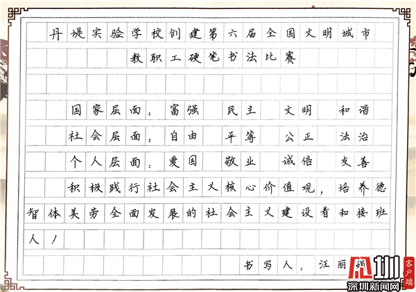 見(jiàn)圳客戶端·深圳新聞網(wǎng)10月29日訊(見(jiàn)圳客戶端、深圳新聞網(wǎng)記者 潘寶儀 通訊員 袁小俊 圖/朱雅琪 ) 為落實(shí)立德樹(shù)人總目標(biāo)、培育和踐行社會(huì)主義核心價(jià)值觀,創(chuàng)建文明城市,積極倡導(dǎo)全校教職工勤練教學(xué)基本功,提高教師綜合素養(yǎng),豐富課余生活,展示丹堤實(shí)驗(yàn)學(xué)校教職工風(fēng)采,學(xué)校于10月25日舉行了“創(chuàng)建第六屆全國(guó)文明城市教職工硬筆書(shū)法比賽”。