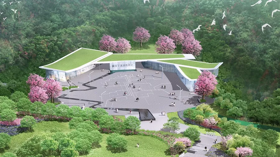 位于人才臺北側(cè)山坡,由三個小平臺及大草坡組成,半坡種植寓意聚賢引才的紫花風鈴木和鳳凰木,是遠眺城市山水的最好位置。
