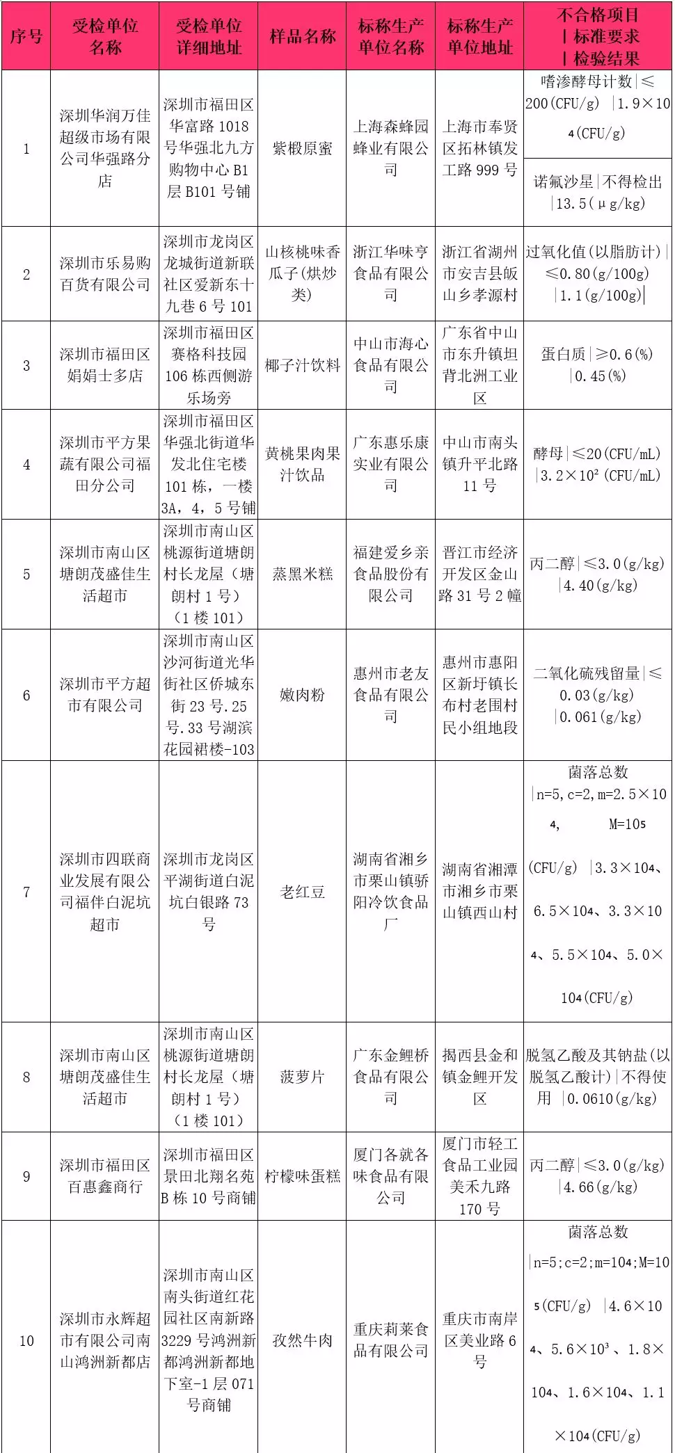 本次共抽檢流通環(huán)節(jié)食品918批次,涉及流通環(huán)節(jié)經(jīng)營主體230家次,共檢測食品指標5434項次。其中檢出不合格樣品10批次,涉及不合格食品類別有炒貨食品及堅果制品1批次,淀粉及淀粉制品1批次,蜂產(chǎn)品1批次,糕點2批次,冷凍飲品1批次,肉制品1批次,水果制品1批次,飲料2批次;涉及不合格項目類別為獸藥殘留、品質(zhì)指標、微生物污染、食品添加劑。