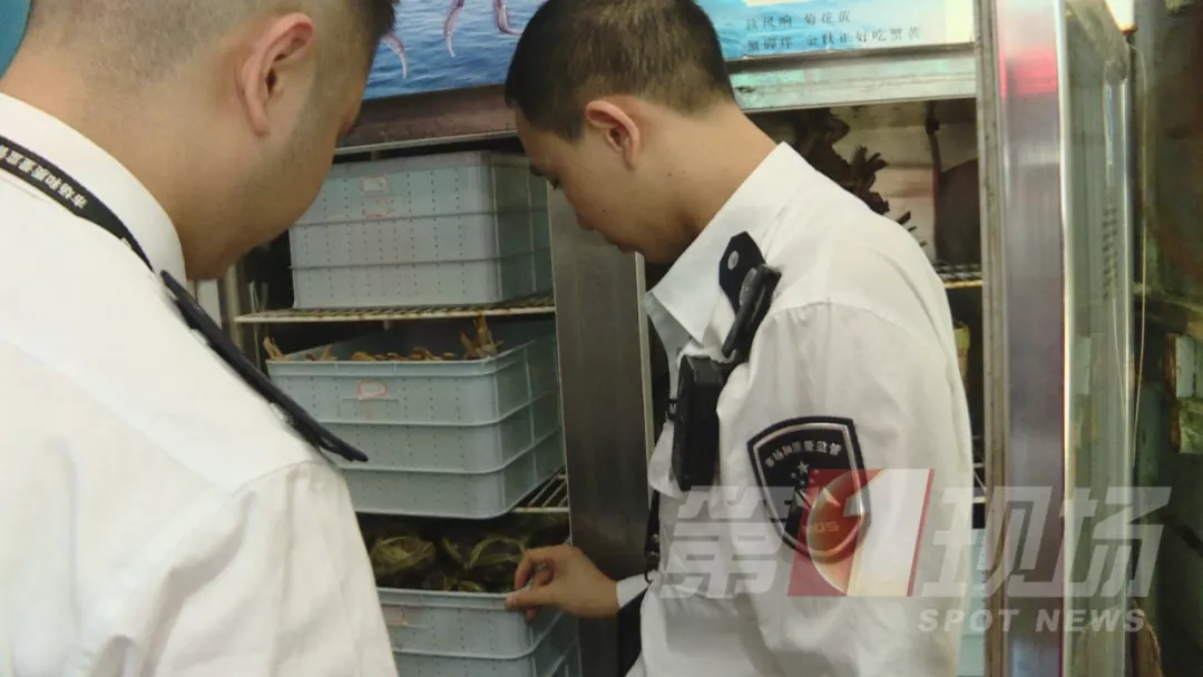 執(zhí)法人員突擊檢查了羅芳水產批發(fā)市場內幾間售賣膏蟹的商鋪,并沒有在店內發(fā)現粗紅繩的蹤影,所有膏蟹以及大閘蟹所捆綁的繩子都是符合規(guī)格的,沒有吸水和壓秤的現象。