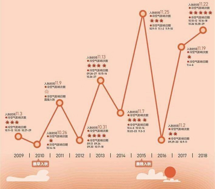 近10年來,深圳入秋的時(shí)間有推遲的趨勢。2009年至2018年10年間,最早的入秋時(shí)間是2010年10月26日,最晚是2015年11月25日,同時(shí)也是深圳歷史上最晚入秋時(shí)間。