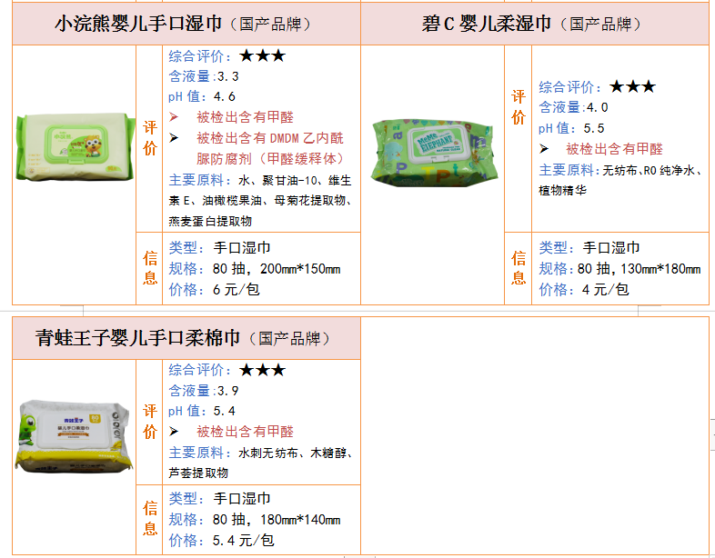 值得注意的是,有5款嬰幼兒濕巾樣品被檢出含有甲醛,但未超過歐盟法規(guī)限值要求??紤]到寶寶的皮膚比較敏感,且很多寶媽直接用嬰幼兒濕巾擦拭寶寶的嘴巴、小手等,建議購買不含甲醛的嬰幼兒手口濕巾。分別是小浣熊嬰兒手口濕巾、青蛙王子?jì)雰菏挚谌崦藿?、子初洋甘菊嬰兒手口柔棉巾、怡恩貝手口濕巾、碧C嬰兒柔濕巾。