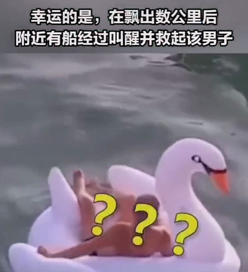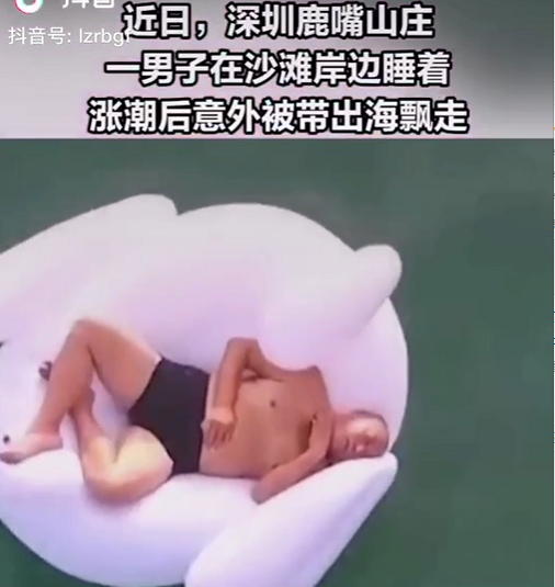 最近,有個視頻很火。視頻中標注:一男子在深圳鹿嘴山莊游玩時,躺在天鵝氣墊上睡著了,漲潮后被帶出海飄走,在飄出數(shù)公里后他被經(jīng)過的船叫醒并救起。