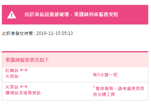 港鐵于今早05:05發(fā)布通告稱,港鐵各線列車服務(wù)延誤或受阻,經(jīng)詳細風(fēng)險評估及相關(guān)政府部門商討后,港鐵各線(機場快線除外)、輕鐵及港鐵巴士的服務(wù)將于晚上10時結(jié)束。由頭班車起,東鐵線大學(xué)至羅湖及落馬洲站暫時關(guān)閉,列車也不停相關(guān)車站。