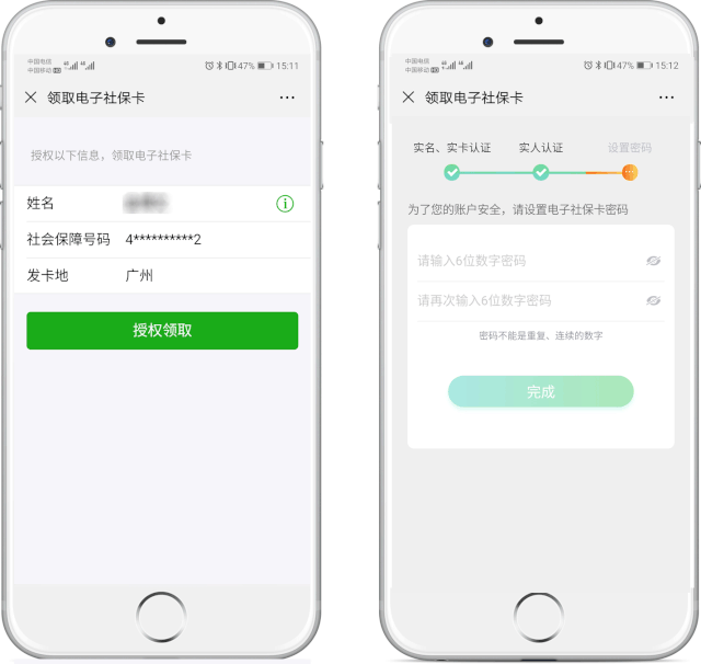根據(jù)提示授權(quán)領(lǐng)取電子社???,并進(jìn)行實(shí)人實(shí)名認(rèn)證后,設(shè)置電子社??艽a,即可完成領(lǐng)取。