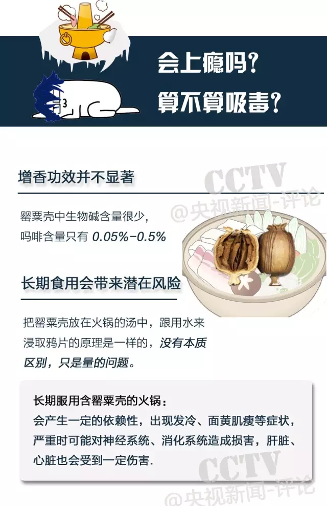 初次食用加入了罌粟殼的火鍋或小吃后,一般有心跳加快、臉色微紅、不易入睡等感覺,這種情況因個(gè)體差異及火鍋中罌粟殼含量而有所不同。