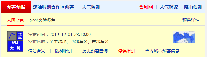 深圳市氣象臺(tái)于12月1日23時(shí)10分在全市發(fā)布大風(fēng)藍(lán)色預(yù)警,預(yù)計(jì)平均風(fēng)力將達(dá)6級(jí)以上(或陣風(fēng)8級(jí)以上),目前大風(fēng)藍(lán)色預(yù)警持續(xù),今天東北風(fēng)4-5級(jí),沿海、高地和海區(qū)陣風(fēng)7-8級(jí)。