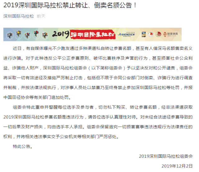 12月2日,深馬組委會(huì)發(fā)布公告,對(duì)于此種違反公平公正參賽原則、破壞比賽秩序及聲譽(yù)的行為,甚至損害社會(huì)公眾利益、詐騙他人財(cái)產(chǎn),深圳國際馬拉松組委會(huì)(以下簡稱組委會(huì))予以堅(jiān)決反對(duì)和公開譴責(zé)。