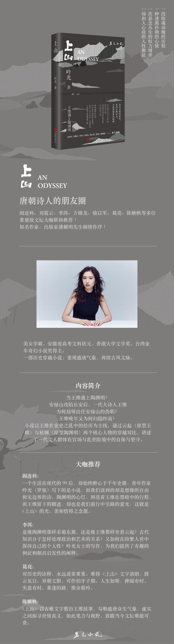 著名作家閻連科表示:“一個(gè)生活在現(xiàn)代的90后,卻始終醉心于千年史冊(cè),青年作家吟光(羅旭)寫下的是小說(shuō),而我們讀到的卻是想像的自由和無(wú)邊界的詩(shī)。陶淵明的心燈,照亮著王維在黑暗中的行程;而王維留下的腳跡,卻也是我們前行中引路的螢光。這就是《上山》的光、美和悟得之念愿。”