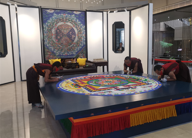 在活動現(xiàn)場,壇城沙畫的現(xiàn)場制作格外引人注目?!耙簧骋皇澜纾蝗~一菩提”——壇城沙畫的過程仿佛一場視覺的盛宴。據(jù)了解,壇城是指對一座宮殿一個世界的泛義,用珍貴珊瑚、瑪瑙、綠松石等礦物質研磨成粉,落沙即成畫,畫面立體生動,壇城展示了高度的藝術魅力和視覺觀感。